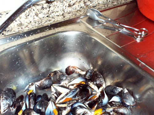 No meu caso, que só tenho um estômago, é tudo mais fácil. Depois de limpar muito bem os bichinhos de barbas e coisas agarradas às conchas azuladas, e de as ter deixado durante umas horas em água salgada para elas largarem areias,-atenção, as conchas têm de estar fechadas, ou, têm de encostar, com pressão; se não se fecharem, lixo com elas - é metê-los a escorrer, e, rapidamente, cortar uma cebola para um tacho onde se deitou uma noz de manteiga. A cebola há-de ficar transparente e depois entra a salsa!E na volta, vão os mexilhões e um copo de vinho branco. Daí a pouco começam a abrir e o meu estômago até já parecem dois! Tapa-se bem tapadinho esperando que o lume faça o resto. Tudo isto não demora nem cinco minutos. Depois colocam-se numa tijela e deita-se aquele molhinho bom por cima, mas com calma e cuidado, para que o sedimento fique no fundo. Usa-se uma concha vazia para abrir e pegar os bichinhos - isso, nem é preciso talher, só mesmo apetite e uma boa companhia para saborear os maravilhosos mexilhões com vinho branco! (Esta receita é que as estrelas-do-mar não sabem!)