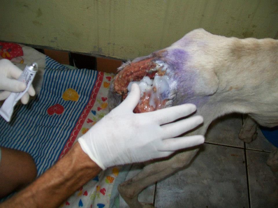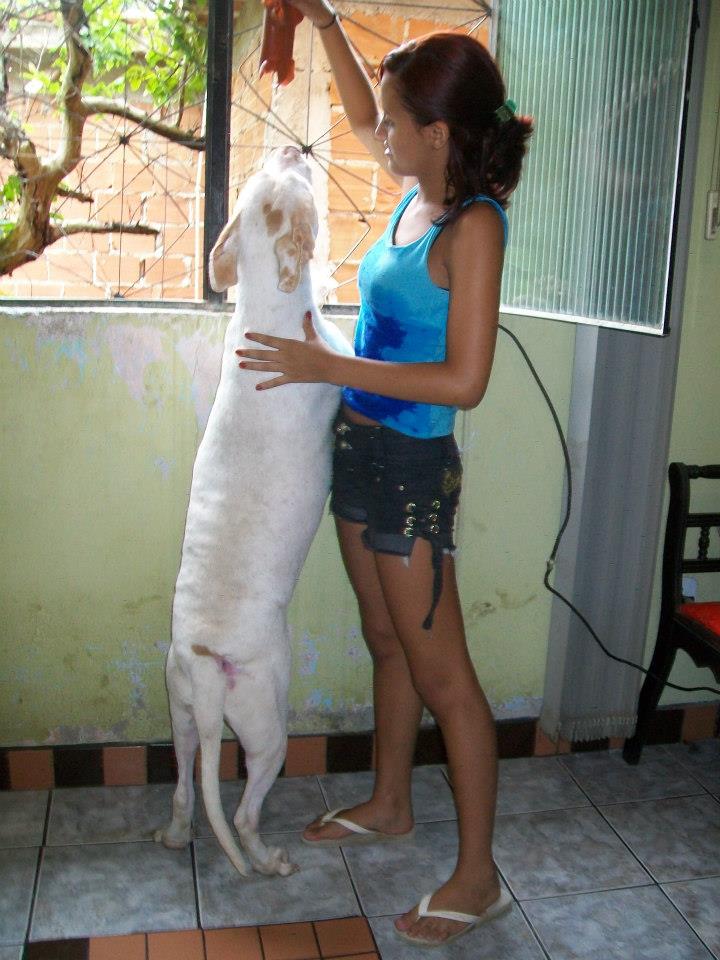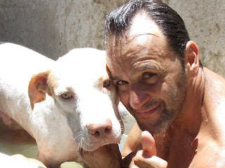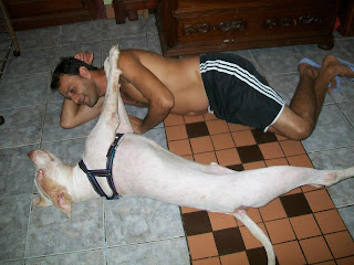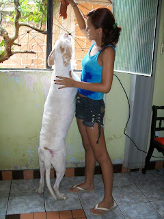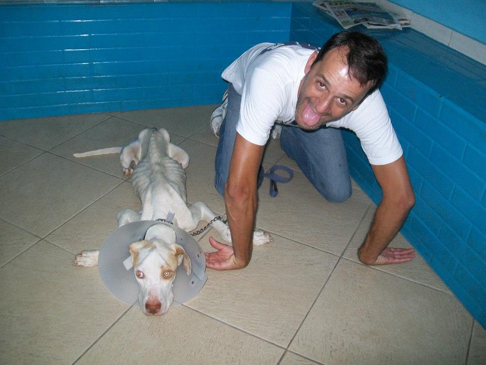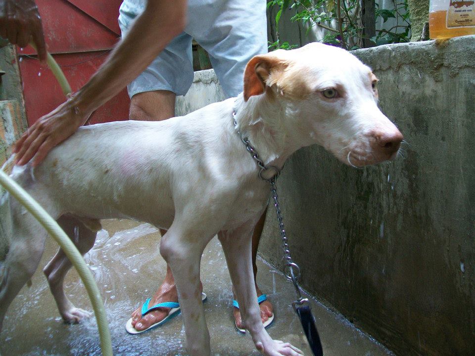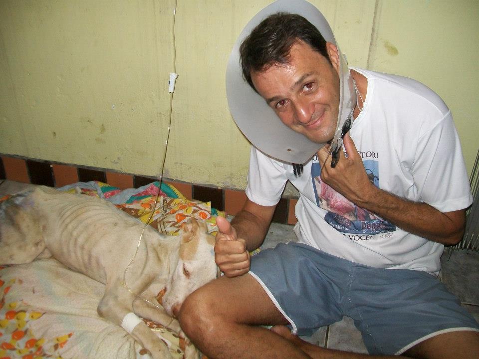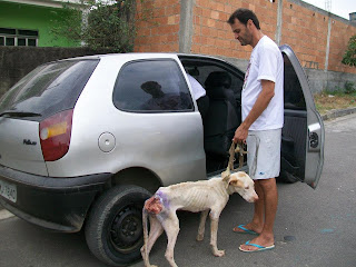 Foi no Facebook que tomei contacto com os resgates de Wilson, segui em particular o caso de Davi, o cão acima. Aconselho uma visita ao album de fotografias "À espera de um milagre". (Precisa ter conta no Facebook e estar ligado para aceder!) Wilson documenta fotograficamente todo o processo. Se apenas relatasse o que faz muitos de nós talvez até duvidássemos da sua palavra pois algumas situações quase ganham o contorno de milagre. O Davi foi resgatado em condições deploráveis em Setembro do ano passado. Tinha 13 kg: o animal, um cão grande, com traços de pit e um lindo par de olhos esverdeados, estava esquelético e apresentava uma enorme ferida perto da cauda. Era um cachorro e foi usado em lutas. Um animal maior arrancou um pedaço de carne dele e deixou o osso à vista. Cheio de doenças que posso adivinhar, anemia certamente e sabe-se lá que outras mais, Davi mal conseguia andar. Ao vê-lo assim muitos teriam pensado que mais valia abater ali o bicho e livrá-o do sofrimento do que escolher curar. Mas Wilson acredita a fundo no potencial de uma vida e na capacidade do amor para salvar. Amor enquanto dedicação, labor e persistência, e amor enquanto inspiração que leva os outros a solidarizarem-se com ele e a colaborarem para o salvamento. Wilson confia no poder na internet para construir uma corrente de salvamentos."Je ne sais pas si vous aller comprendre ma languer mais je voie tout ce que vous faite a tous ses animaux et merci yen a peu comme vous et vous ete geniale en tout cas merci de ma part et pour les animaux que vous sauvez de la mort !!" Na sua página li mensagens como esta, que outros visitantes vão traduzindo para Wilson. A língua não é barreira, as palavras são apenas um pormenor. As imagens mostram o grande amor de Wilson pelos animais e a sua luta contínua. Os visitantes dão-lhe os parabéns, rejubilam com cada conquista, invocam a benção de Deus e pedem-lhe que dê forças a Wilson, a quem apelidam de anjo. Pedem a benção de São Francisco, padroeiro dos animais. Wilson vive numa casa modesta, está actualmente desempregado, e no caso do Davi ele colocou o cão a viver no seu próprio quarto. Mesmo mostrando as fotografias há quem duvide da honestidade e capacidade de Wilson para tratar os animais, mesmo se ele tem a ajuda de veterinárias. "Não basta ser só vet, é preciso ter amor no coração," - diz Wilson. A veterinária faz os curativos no chão pois não há uma mesa no quarto de Wilson. Mas o que importa é resolver a situação, mesmo que as costas curvadas sofram. Davi não tinha pele suficiente para cozer a ferida mas a veterinária conseguiu diminuir o seu tamanho. Até hoje eu não sei bem como é que o cão ficou assim. Mas o desprezo humano pela vida dos animais não é incomum. Pomada de sulfadiazina de prata num dia e colagenese no outro, mais uns quantos fármacos. Transfusão sanguínia. Depois muito carinho e cuidados. Muitas visitas de gente amiga. Mensagens aos montes na internet. Muito amor. Mas também donativos em dinheiro e em géneros. O Davi vai apresentando melhoras graduais e desenvolve um apetite de leão. Ganha energia e já faz bagunça, pega uma almofada e não larga! Quer brincar, é bom sinal. Soro e vitaminas. Todos os dias é preciso limpar o ferimento e voltar a fazer o curativo. Uma veterinária opina que Davi ainda não tem dois anos sequer. Após um mês Davi parece outro. A carne já cobre as suas costelas, a sua pelagem está branca depois de um bom banho perfumado e tem até bolo de arroz com carne e osso moído para festejar! O Davi melhora a olhos vistos e começa a roer tudo: a caminha nova, a cómoda que uma amiga ofereceu a Wilson, os puxadores e até um coco. Chegam brinquedos de cão, oferecidos, que apenas duram um dia! As últimas fotografias são de ontem e mostram um outro Davi, aquele que ele devia ter sempre sido, o rei Davi. Ao vê-las não resisti a divulgar a sua história e a de Wilson. Mas mais importante do que lerem o que escrevi, é irem até ao Facebook e verem por vós mesmos o que Wilson faz. E, claro, se puderem e quiserem, não deixem de ajudar Wilson. Deus sem dúvida alguma que quer, Wilson sonha e a obra nasce.