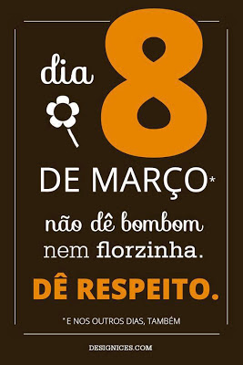 Ontem essa imagem estava a circular no Facebook. Na minha opinião de mulher gulosa, chocolate é sempre bem vindo, flor murcha ao fim de uns dias, dispenso flor, o lugar de flor é no jardim. Mas respeito é melhor que chocolate e flor em conjunto! Dê respeito no dia 8 de Março e nos outros dias também. Quer seja homem, marido, pai, irmão, primo, amigo, colega, dê respeito. Reconheça o que é diferente na mulher e compreenda. Reconheça o que é igual e apoie. Não fique calado perante a discriminação, denuncie. Esteja lado a lado.