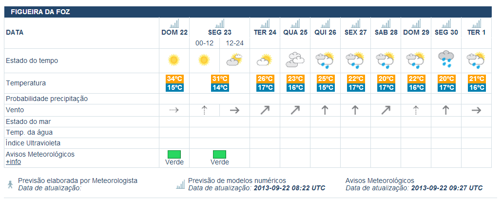 O Outono começou no passado domingo, às 21H44, num dia com temperaturas bastante elevadas. Pelo gráfico do site do Instituto Português do Mar e Atmosfera (IPMA) eu antecipei que era o fim do bem bom pelo que me apressei a tratar da vidinha para poder correr para a praia. Setembro e Outubro não são carne nem peixe. Pode fazer calor, pode fazer frio. Não é incomum vermos pessoas de manga curta e sandalinha no pé e outras já todas equipadas para o pior, aproveitando para exibir as pecinhas outonais recém compradas. Eu sou das que costuma resistir a essas novas indumentárias o mais possível! Faço o que posso para esquecer que o Outono já chegou! Em Outubro de 2011 ainda ia à praia, isso é que foi! Quando já toda a gente andava louca por causa da falta da chuva eu rejubilava. É um facto comprovado pelos senhores da meteorologia, os Outubros estão cada vez mais quentes. Não consta que este vá ser assim. Hoje quando acordei ouvi logo o som dos pneus dos automóveis a rolar sobre o piso molhado. Estava assim oficialmente inaugurada a época de neura.