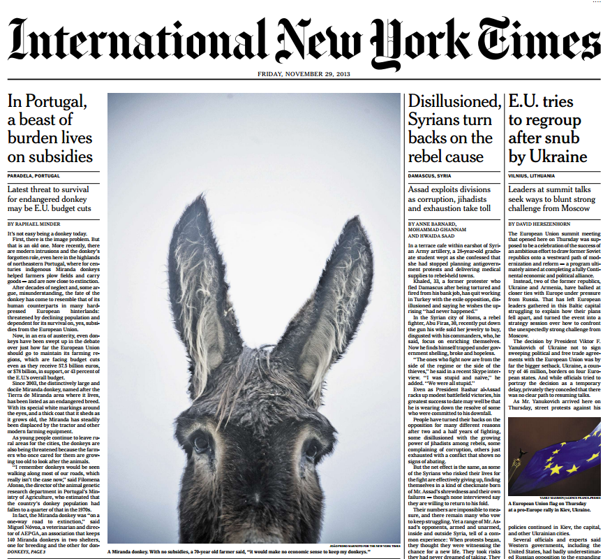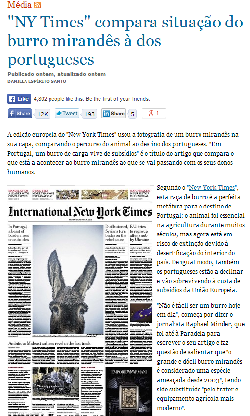 Na edição em papel, lê-se "In Portugal, a beast of burden lives on subsidies - Latest threat to survival for endangered donkey may be E.U. budget cuts. Isto é: Em Portugal, um animal de carga vive de subsídios. - A última ameaça à sobrevivência do ameaçado burro poderá ser o corte orçamental da União Europeia.